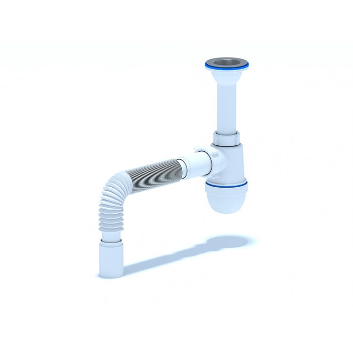 Сифон для кухонной мойки с диаметром сливного отверстия 50мм, бутылочного типа, с литым выпуском и нержавеющей решеткой, для подключения к канализации комплектуется гибкой трубой 40*40мм.